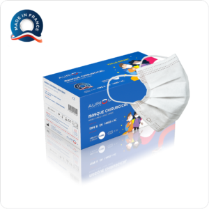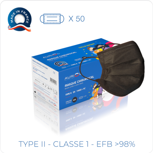 Masque chirurgical pour enfant de couleur noire type II à élastiques ronds fabriqué en France ;