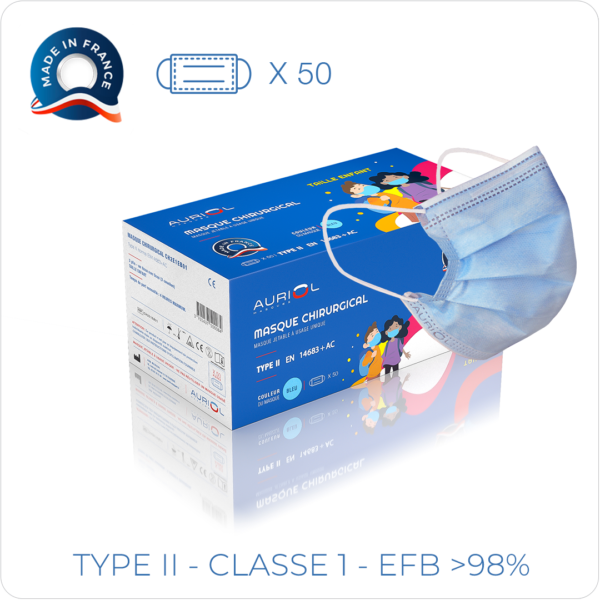 Masque chirurgical pour enfant de couleur bleue type II à élastiques ronds fabriqué en France ;