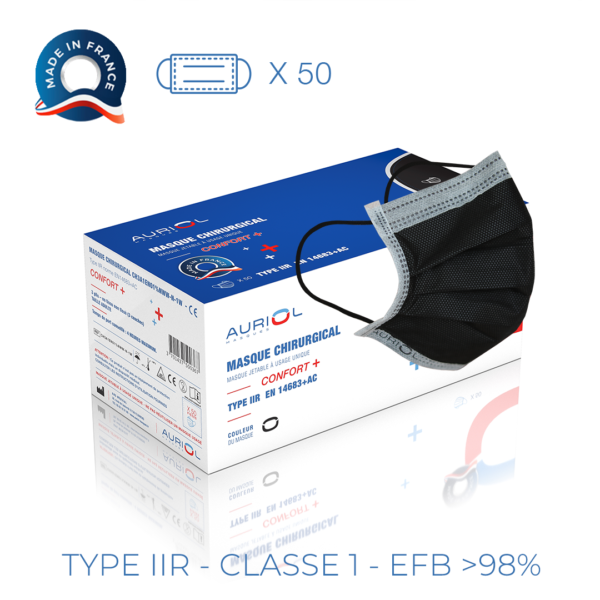 Masque chirurgical de couleur noire Type IIR avec doublure Medical Confort+. Élastiques Ronds.
