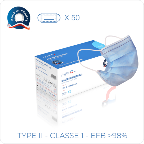 Masque chirurgical bleu type II à élastiques ronds fabriqué en France ;