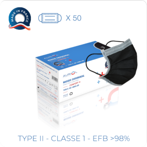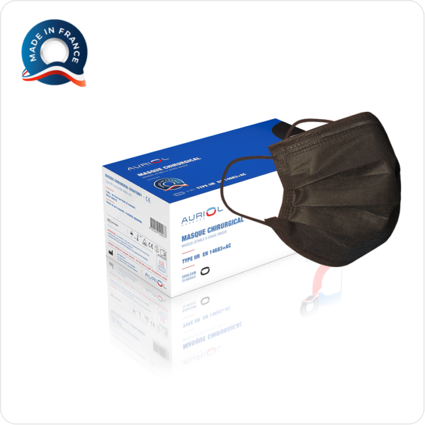 Masque chirurgical noir type IIR à élastiques ronds fabriqué en France ;