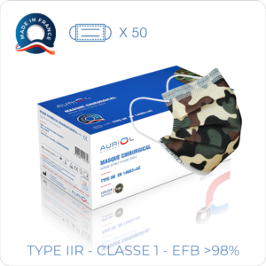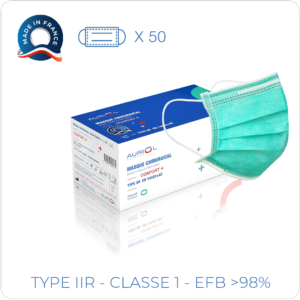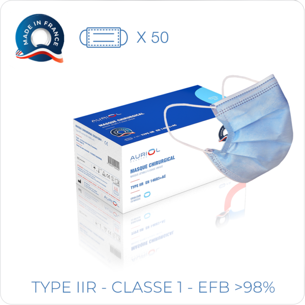 Masque chirurgical bleu type IIR à élastiques ronds fabriqué en France ;